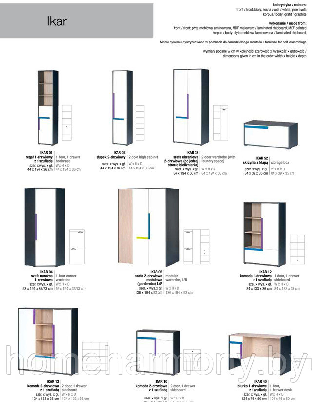 IKAR, отвечающая самым современным тенденциям, предназначена для обустройства комнаты ребенка. Стильный и яркий интерьер такой детской не останется незамеченным. Модульность коллекции позволяет свободно комбинировать элементы, создавая самые разнообразные комплекты как для отдыха, так и для учебы. Благодаря большому выбору цвета ручек мебель Шинака Икар позволяет организовать интерьер детской, соответствующий темпераменту ребенка.