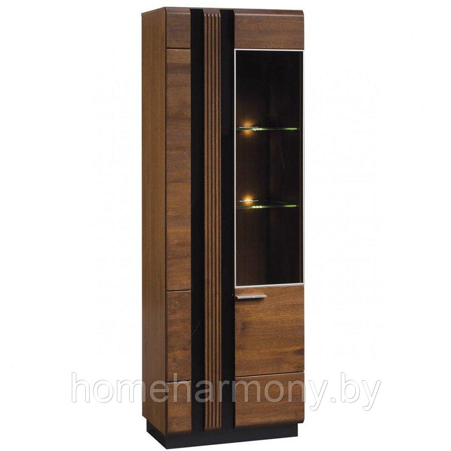 Витрина двухдверная правосторонняя PORTI 11 Szynaka (Польша) с двумя стеклянными полками за левой дверцей. В центральной части фасада расположена фрезерованная деревянная часть с окантовкой из черного закаленного стекла. Дополнительно витрина комплектуется подсветкой.