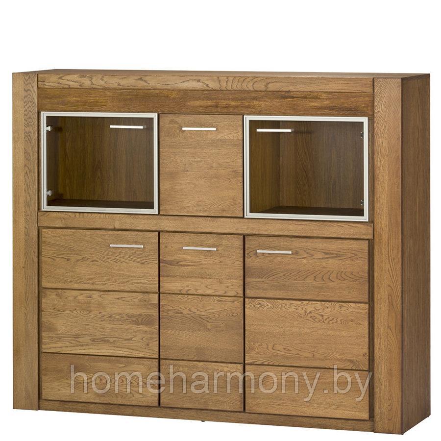 Комод с баром VELVET 48 Szynaka (Польша) декорирован внешней горизонтальной подсвеченной вставкой. В верхней части – две боковые стеклянные дверцы и одна откидная по центру. В нижней части – три дверцы, за каждой из которых установлено по две полки. Буфет дополнительно комплектуется подсветкой.